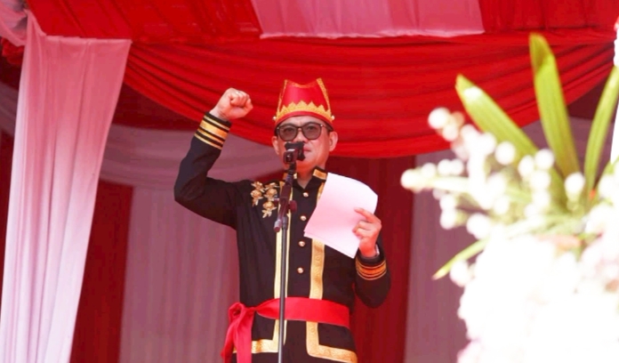 āDengan mengenakan pakaian adat Minahasa, Bupati Joune Ganda bertindak selaku Inspektur Upacara (Irup).