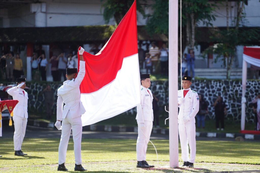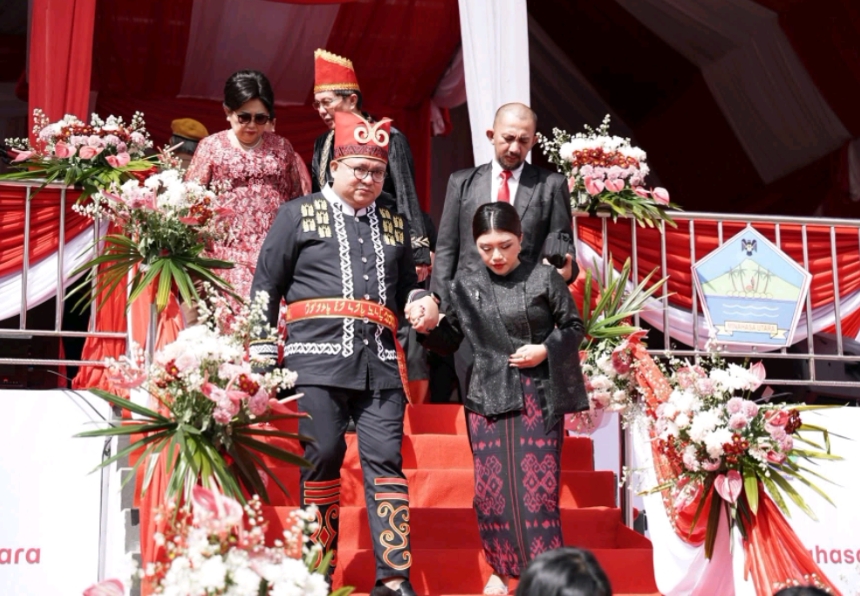 โDengan mengenakan pakaian adat Minahasa, Bupati Joune Ganda bertindak selaku Inspektur Upacara (Irup).