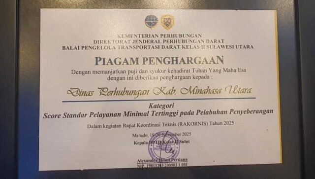 โ๐๐๐๐๐ – Pemerintah Kabupaten Minahasa Utara, Dinas Perhubungan meraih Penghargaan Kategori Score Standar Pelayanan Tertinggi pada Pelabuhan Penyeberangan pada Tahun 2025 dari Kementerian Perhubungan, Rabu (19/11/2025).